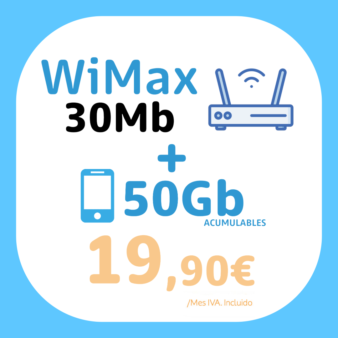 Si resides en una de nuestras zonas Blue WiMax, disfruta de una oferta aún más especial: WiMax 30Mb + línea móvil con 50Gb acumulables por solo 19,90€ al mes con IVA incluido. ¡El doble de ventajas al mejor precio!
